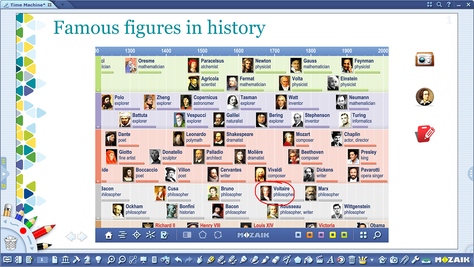 Here at Mozaik we are passionate about History and really want this wonderful subject to flourish in classrooms all over the world. One of the ways we are hoping our software can inspire students to learn history is our absolutely unique educational tool called “Time Machine”. Time Machine is designed to help students make connections between historical personalities according to their nationality, profession, date of birth and (in)famousness.