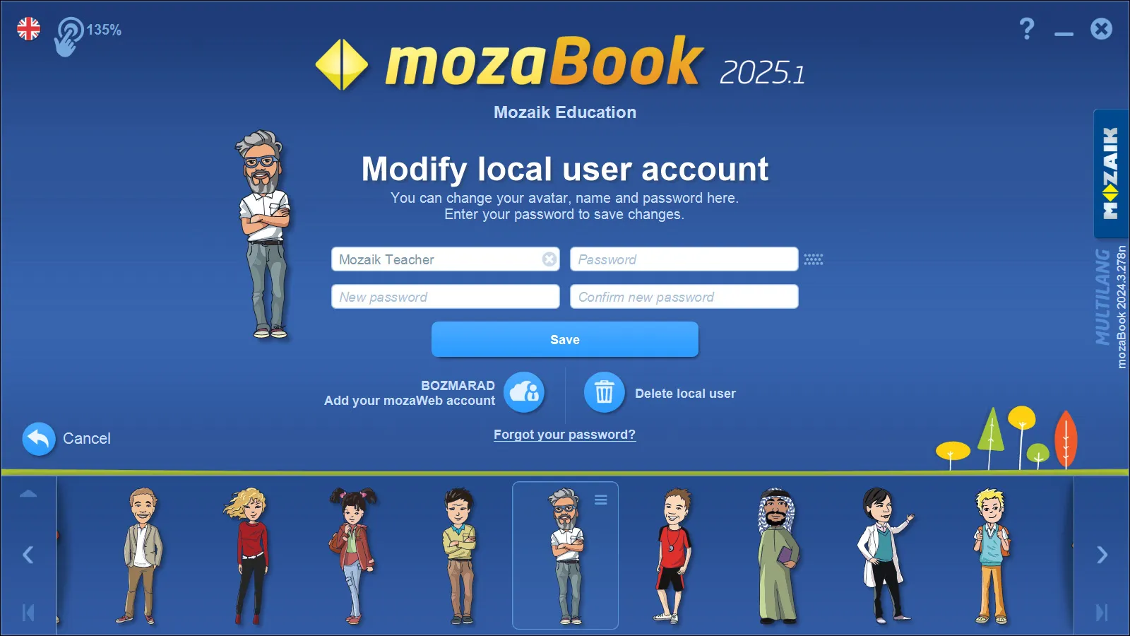 يتيح الموزابوك غمكانية استخدام البرنامج على حاسوب واحد من قبل عدة مستخدمين (مثلاً: عدة مدرسين في صف دراسي). سوف يتم حفظ الرسومات و الملاحظات و المحاضرات و المحتويات المدرجة دائماً في حساب المستخدم المحلي و بالتالي فهو الوحيد الذي يمكنه رؤيتها. لهذا من الضروري أن يقوم البرنامج بالتعرف على المستخدم المحلي.
