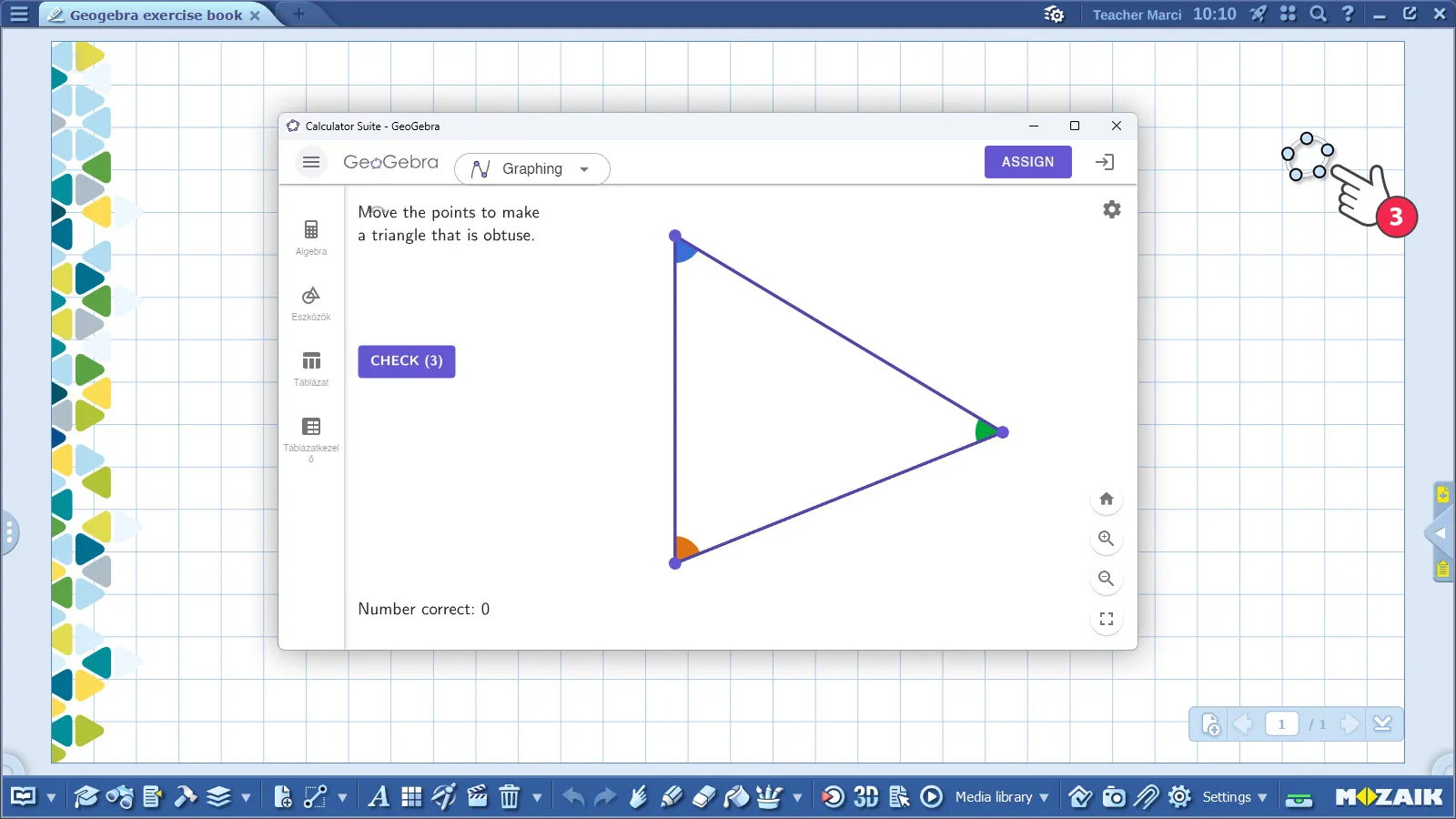 You can open and use GeoGebra content in mozaBook. The extension of GeoGebra files is .ggb. You can find these in the Geometry menu of the Media library (1).
