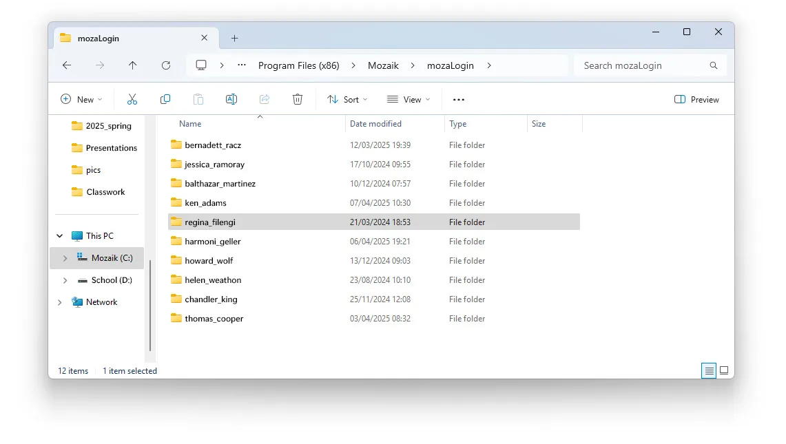 If you do not know the password for the local user account, close mozaBook and open the mozaLogin folder in mozaBook's installation folder. According to default settings, this folder can be found here: c:\Program Files (x86)\Mozaik\mozaLogin\