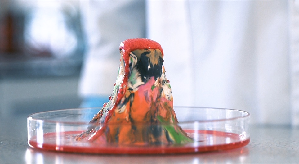 نقوم بنمذجة ثوران بركاني عبر تفاعل بيكربونات الصوديوم و الخل ملوناً بصبغة الطعام الحمراء اللون.
