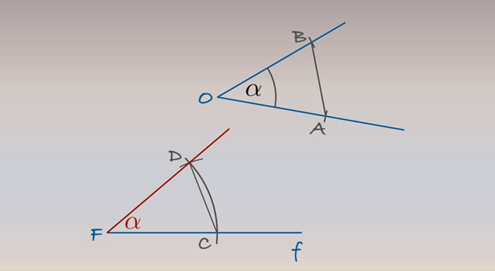 ننسخ زاوية ألفا المحدبة المعينة على نصف مستقيم f ذو نقطة بداية F.