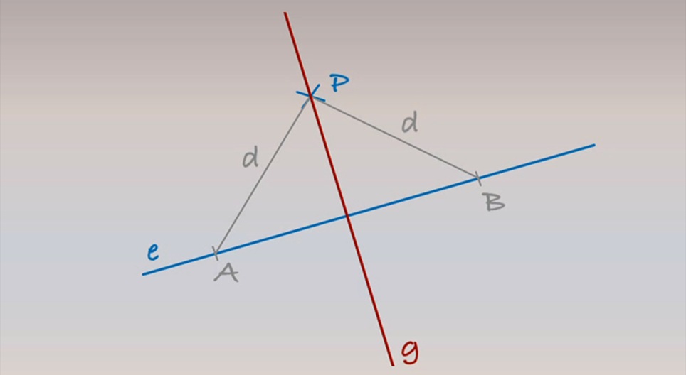 لدينا المستقيم e و النقطة P التي تقع خارجه. فلنقم برسم المستقيم g العمودي على المستقيم e من النقطة P.