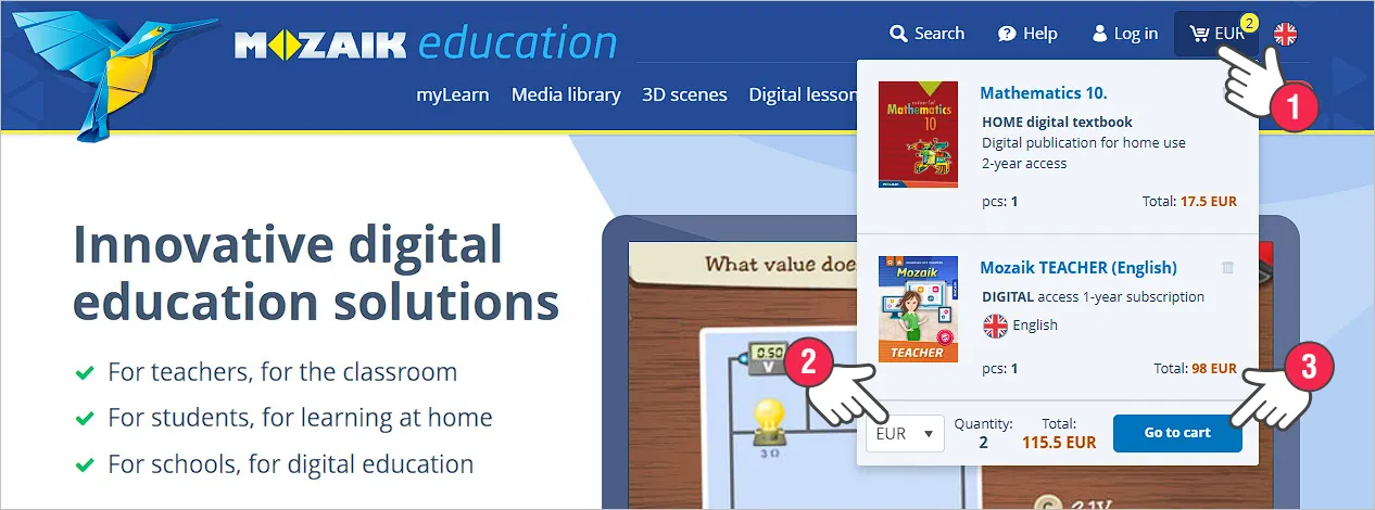 في حال وضعت كل الأشياء التي تود شراءها في السلة انقر على رمز السلة الموجود في العنوان الرأسي (1) ثم انقر فوق زر سلتي الموجود في القائمة المنسدلة (2).