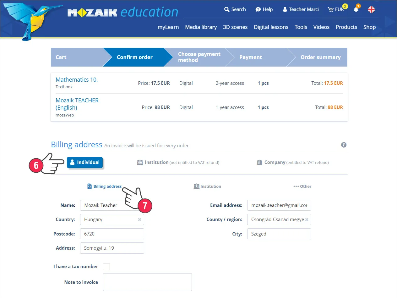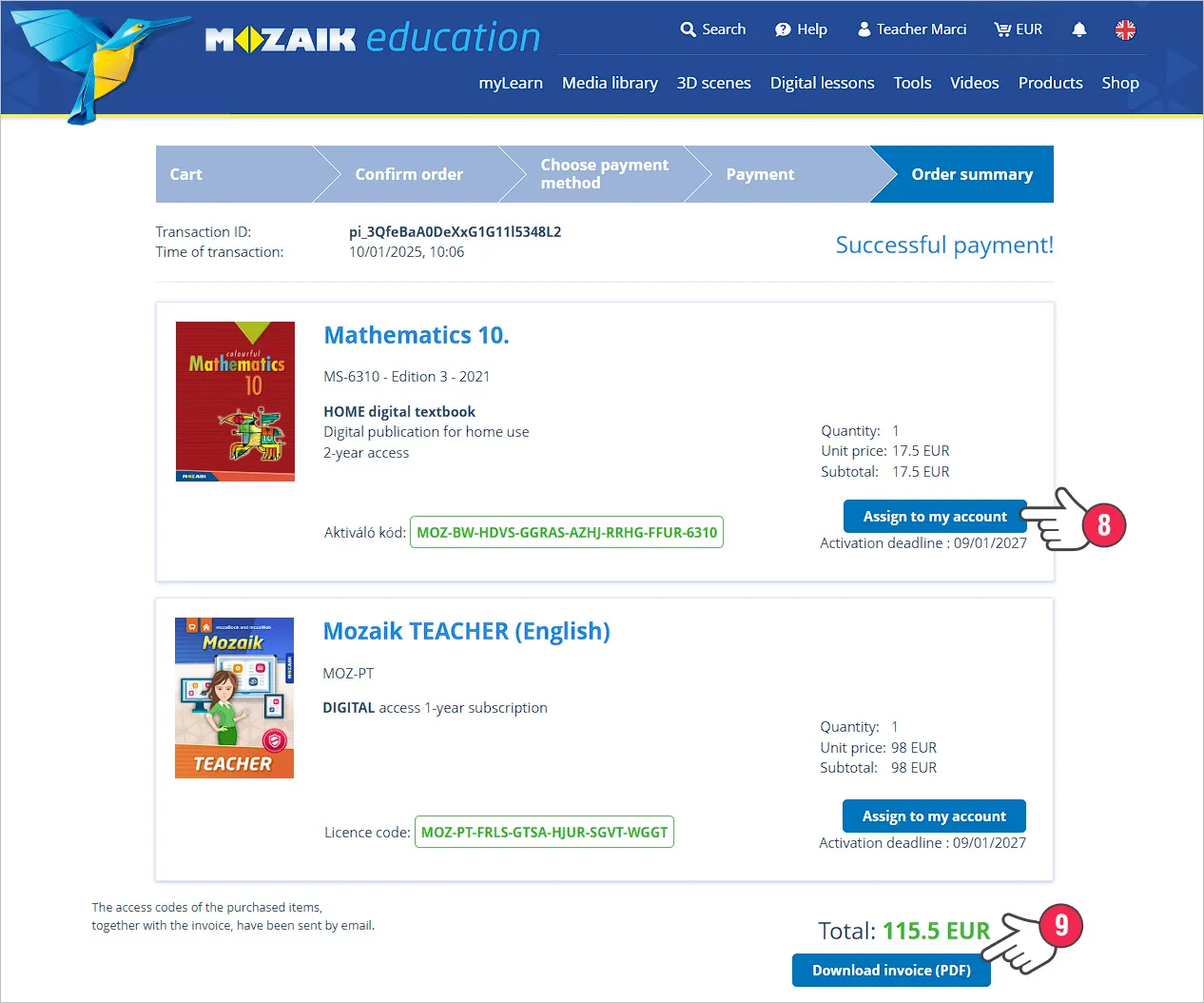 بعد نجاح علمية الدفع سنقوم بتوجيهك نحو صفحة تحتوي على موجز الشراء حيث يمكنك رؤية المنتجات التي تم شراؤها. في هذه الصفحة يمكنك رؤية رمز تفعيل أو ترخيص المنتجات التي تم شراؤها (8). يمكنك تفعيل الكتب الرقمية و اشتراك الموزاويب بريميوم على هذه الصفحة بنقرة زر و بهذا ستتمكن من وصلها بحسابك (7). بإمكانك تحميل الفاتورة أيضاً (9).